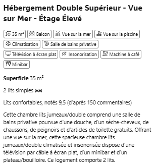 Conçue pour accueillir deux adultes au maximum, cette chambre comprend des services exclusifs tels que carte d’oreillers, couettes et draps, cafetière, bouilloire, minibar de courtoisie, peignoir, chaussons, tongs, coffre-fort et service d’étage. Tout est pensé pour garantir un séjour confortable, personnalisé et sans souci.