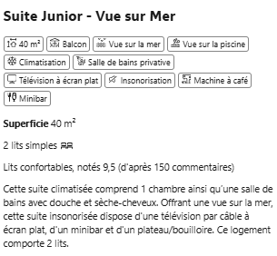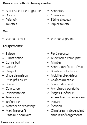 La suite dispose également de la climatisation, de l’insonorisation, d’une télévision à écran plat, d’une machine à café, d’une bouilloire et d’un minibar offert, ainsi que d’un peignoir, de chaussons, de tongs et d’un coffre-fort. Le service de room service et la carte des oreillers permettent de personnaliser chaque séjour au maximum. Avec une vue directe sur la mer et la piscine, cet espace est idéal pour deux adultes recherchant confort, intimité et cadre privilégié.