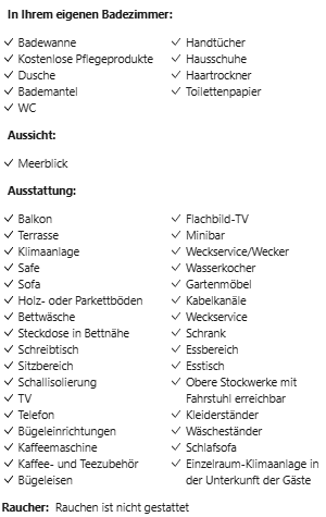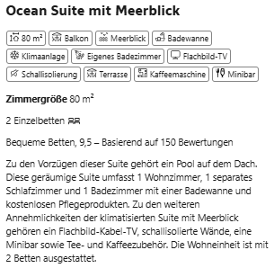 Mit einer Innenfläche von 80 m² besticht die Suite durch ihr zeitgenössisches, elegantes und lichtdurchflutetes Design. Die Räume sind so konzipiert, dass sie Großzügigkeit und Privatsphäre bieten, mit einem separaten Schlafzimmer, ausgestattet mit zwei komfortablen Einzelbetten, einem abgetrennten Wohnbereich sowie einem Badezimmer, das das Ritual der Erholung auf ein neues Niveau hebt. Die freistehende Badewanne, die Regendusche und die exklusiven Per-Purr-Amenities machen jeden Moment zu einem sinnlichen Erlebnis. Ergänzt wird dies durch eine spektakuläre Außenterrasse, ideal, um das milde Inselklima und unvergessliche Sonnenuntergänge mit Blick auf das Meer zu genießen.